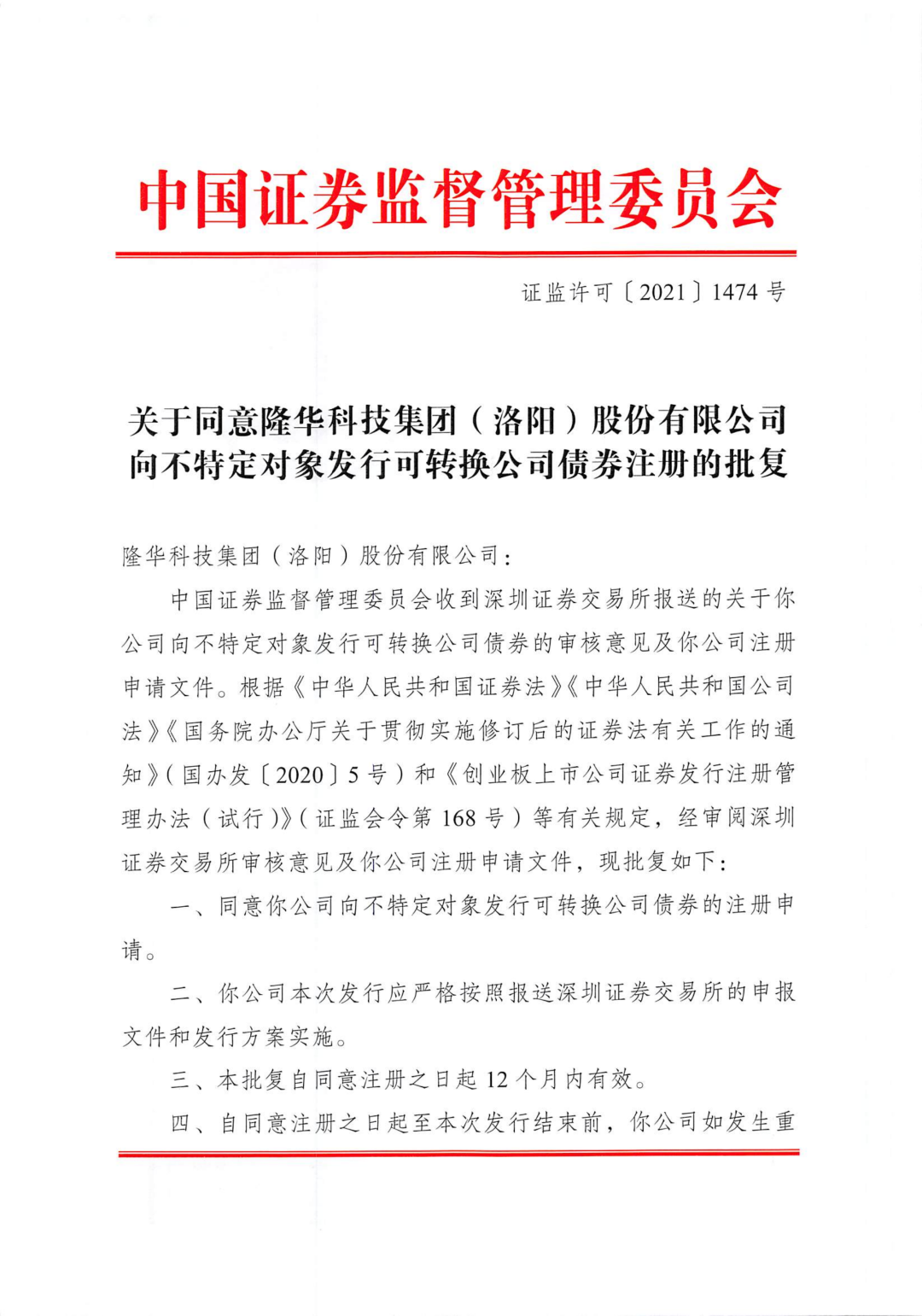 近日,隆華科技收到中國證券監督管理委員會出具的《關于同意隆華科技集團(洛陽)股份有限公司向不特定對象發行可轉換公司債券注冊的批復》(證監許可〔2021〕1474號)。