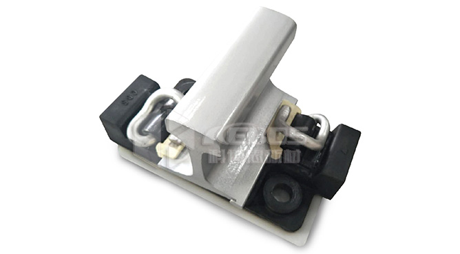 壓縮硫化型減振扣件主要由粘接墊板、調距齒塊、錨固螺栓等零部件組成,與普通彈性分開式扣件相 比,減振效果可達(5~8) dB。該扣件系統結構緊湊、重量輕、零部件少、安裝維修方便,可用于城市 軌道交通新線鋪設或既有線改造,也適用于高架線小阻力路段,具有廣泛適應性。
